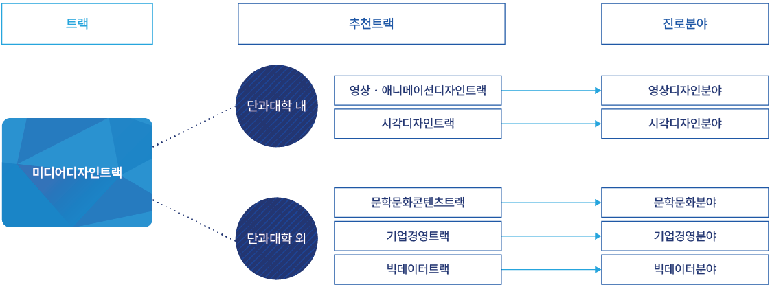 - AI로 인해 급격한 변화가 거듭되고 있는 오늘날, 각종 미디어서비스에 대한 새로운 기획과 디자인 그리고 AI활용 능력이 더욱 중시되고 있다. 미디어디자인 트랙은 현 시대의 주된 커뮤니케이션 방향과 트렌드를 반영한 트랙이다.