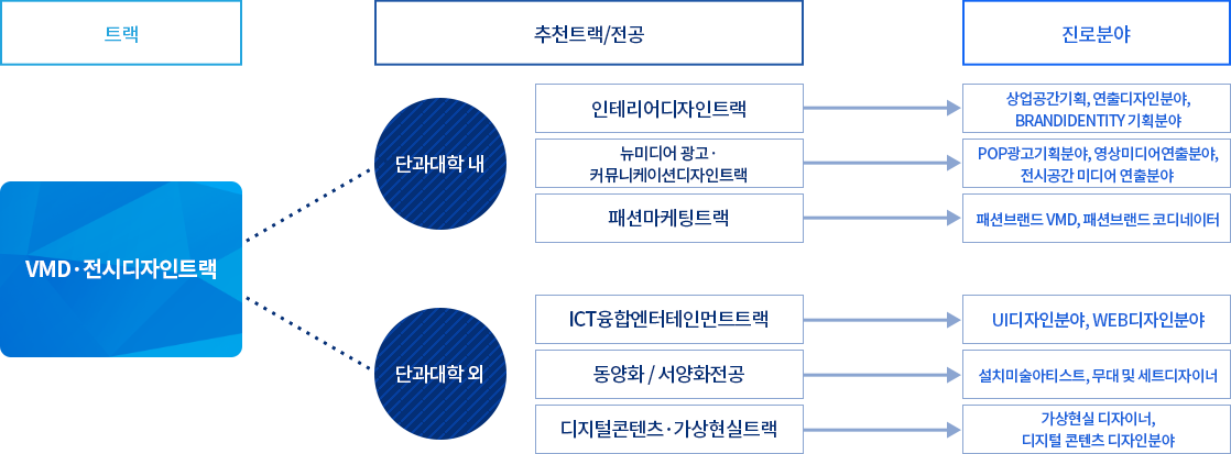 - VMD란 Visual Merchandiser의 줄임말로, 매장 등 상품을 판매하는 환경을 시각적으로 기획하는 전문가를 의미한다. VMD는 마케팅 목적을 효율적으로 달성할 수 있도록 특정 상품이나 서비스를 시각적으로 연출하고 관리한다. 예를 들어, 매장을 신규 개설할 때 어떤 콘셉트로 상품이 구성·배치돼야 효과적인지를 판단하고, 매장이 위치한 지역의 특성을 분석해 인테리어와 주력 제품을 결정하는 등의 역할을 한다. 전시디자이너는 전시공간을 디자인하는 디자이너를 말한다. 박물관, 과학관, 미술관, 기업전시관, 기업시연회, 쇼룸, 순회 전시 등 대중을 상대로 전시하는 공간을 디자인한다. VMD와 전시디자인은 단순한 마케팅기법이 투입된 전문적인 분야로서 전략적인 사고와 디자인 능력을 동시에 발휘해야 하는 융복합적 판단력을 필요로 한다. 따라서 디자인분야 뿐만 아니라 전략적 사고를 가지는 타 트랙과도 훌륭히 융합이 가능한 분야이다.