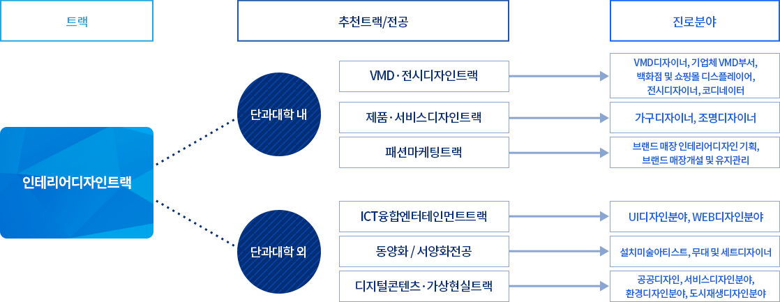 - 인테리어디자인은 공간과 환경을 보다 창의적이고 기능적이며 쾌적한 공간으로 창출해나가는 실용적인 학문임. 현대의 공간은 과학과 문화의 발전에 따라 변화하고 있고 새로운 공간이 창출되기도 하며 삶의 패턴이 변함에 따라 진화하고 있음. 인테리어디자인트랙은 실내공간의 영역을 넘어 환경디자인의 영역까지 사회문화의 변화에 따라 요구되는 인간을 위한 공간을 디자인할 수 있는 능력을 키움