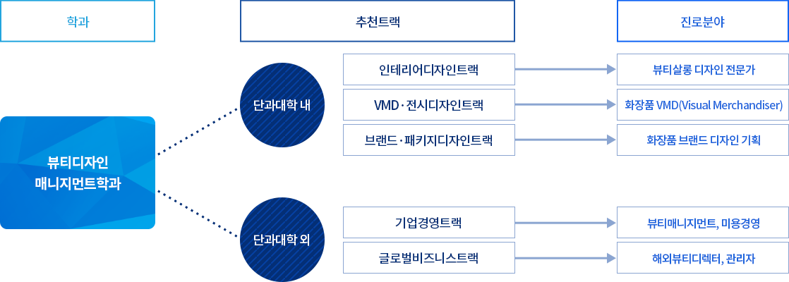 - 뷰티디자인트랙은 헤어디자인, 메이크업, 에스테틱, 네일 등 실무적 기술뿐만 아니라 교양과 트렌드 감각을 익힌 뷰티아티스트로 진출함