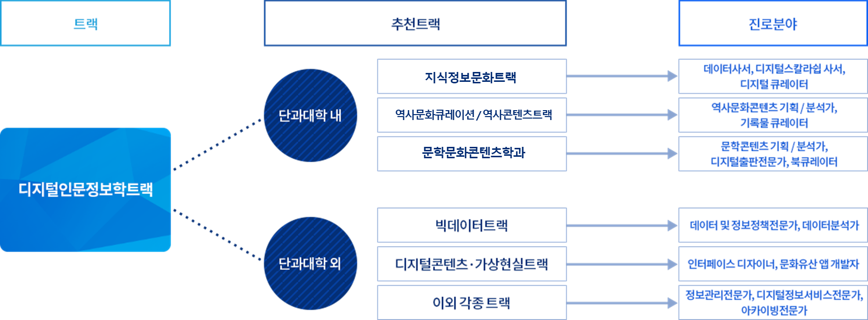 - 디지털인문정보학은 인문학에 디지털 기술을 적용하여 콘텐츠를 기획, 축적, 가공할 수 있는 능력을 겸비한 디지털큐레이터, 콘텐츠기획자, 정보관리전문가를 양성하는 트랙입니다.