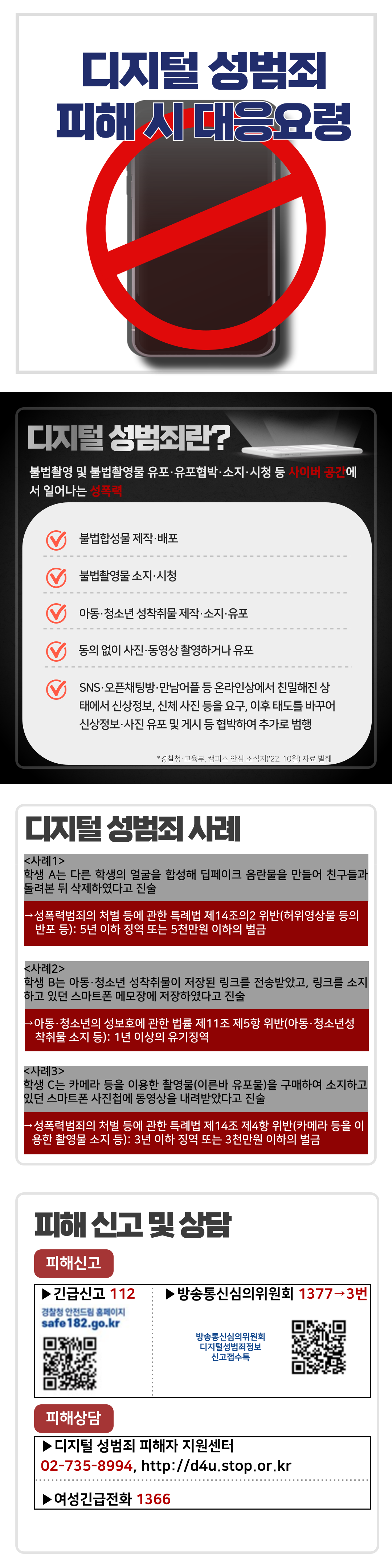 피해 발생 시, 긴급신고(112) 또는 방송통신심의위원회(1377→3번)로 신고하여 주시고,