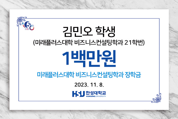 미래플러스대학 비즈니스컨설팅학과 김민오 학생 장학금 1백만원 기부- 작성자 미래플러스대학 교학팀