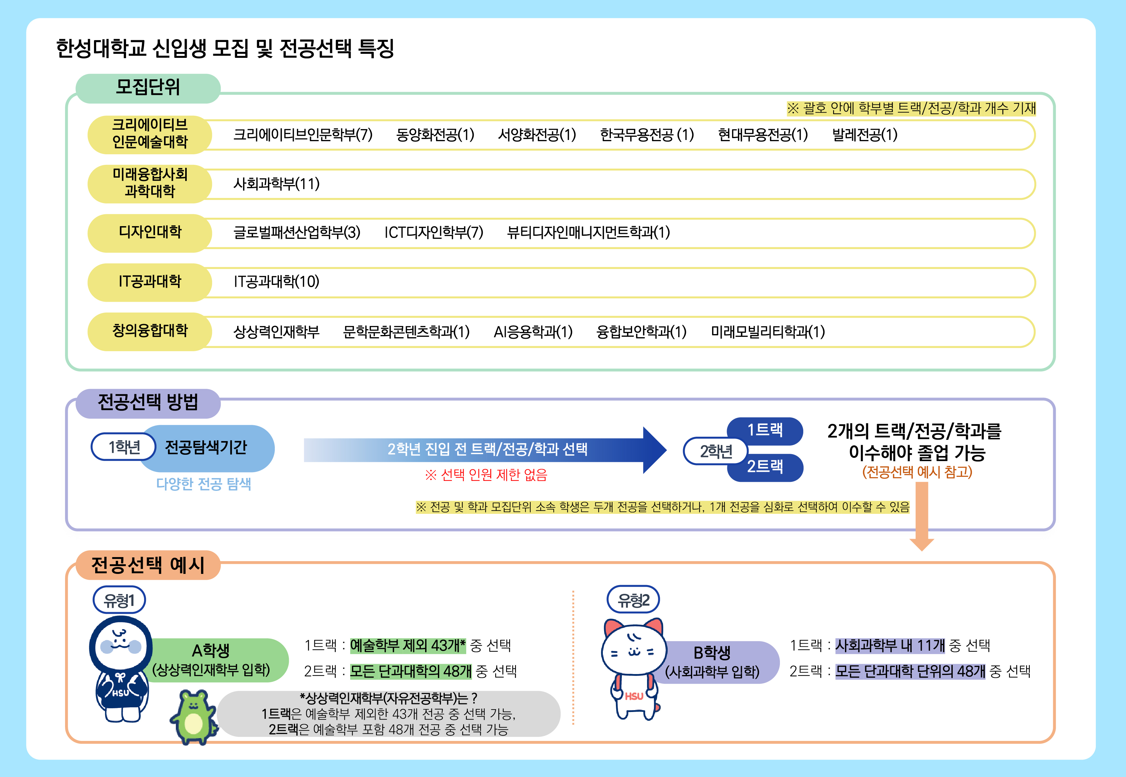 - 유형 2(상상력인재학부를 제외한 단과대학/학과) : 단과대학/학과를 선택하여 입학 후, 1트랙은 입학한 단과대학에서 선택하고 2트랙은 대학 전체 전공트랙/학과에서 선택