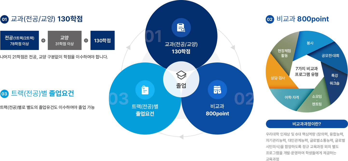 교과 및 비교과 교육과정 이수체계 우리 대학은 교과 130학점, 비교과 800point, 트랙·학과·전공별 졸업 요건을 충족해야 함 교과는 130학점 중 전공 교육과정 78학점, 교양 교육과정 31학점을 교과목 이수구분별 지정된 학점을 필수로 이수해야 함 학번별 졸업 최소 이수 학점 학번별 졸업 최소 이수 학점 안내표 - 구분, 교과 교육과정, 비교과 교육과정 구분 교과 교육과정 비교과 교육과정 16학번 이후 130학점 800 포인트 15학번 이전 140학점 -