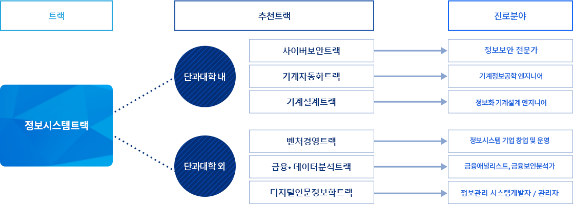 - 시스템통합을 포함하는 정보시스템 분야는 IT기술의 급속한 변화에 대응하면서도 항상 일정한 공공과 민간의 인력 수요를 요구하는 전문 분야임. 트랙 교육과정에서 시스템통합 요소기술 이해, 응용 소프트웨어 설계와 정보시스템 문제 해결을 위한 과목을 제공함. 정보시스템 설계 및 분석, 개발 능력을 갖는 기술자를 양성하는 것을 목적으로 함