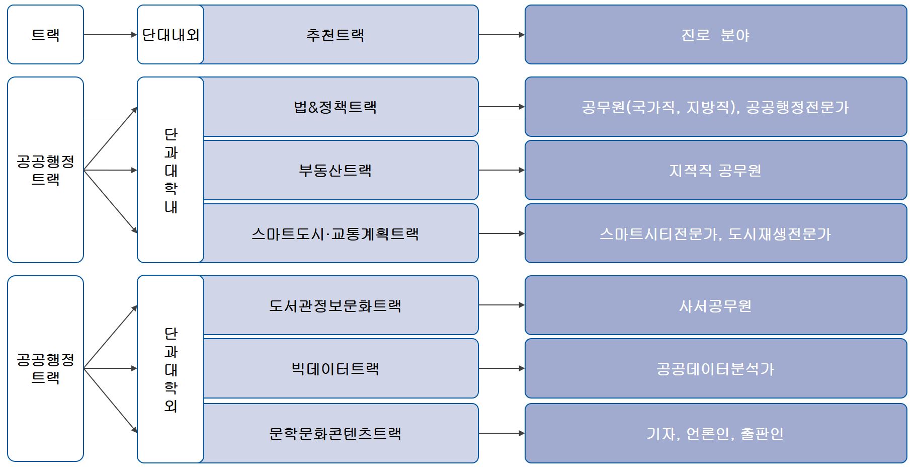 - 공무원 및 공공부문에 대한 수요가 급증하고 있으며, 공직에 대한 진출 수요도 급증하고 있다. 공공행정트랙은 행정 현상에 대한 체계적인 교육과정을 통해 공직 전문성을 배양하고, 인격 함양 프로그램을 바탕으로 공직을 비롯한 공공부문 각 분야에서 중추적인 역할을 할 수 있는 인재를 배출하는 것을 목표로 삼는다. 공공행정트랙은 조직, 인사, 재무 등 행정학에 대한 기본 이해를 바탕으로, 정부와 공공부문에서 요구하는 공직윤리, 공법체계에 대한 이해, 지방자치, 전자정부, 기타 분석 역량을 발휘하여 공직자로서의 윤리 의식과 공직수행 역량을 갖춘 인재를 양성하는 것을 목적으로 한다.