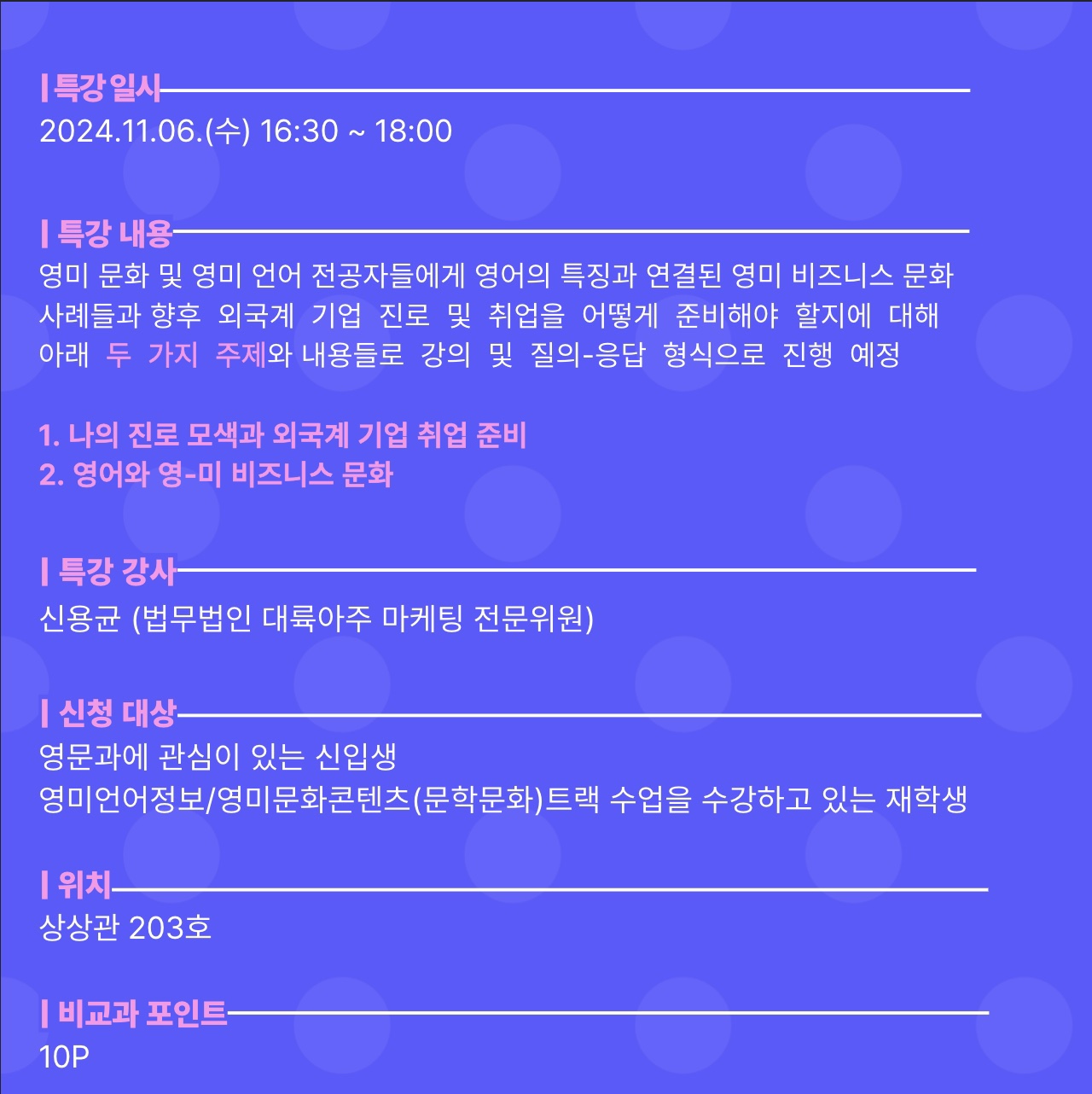 강사: 신용균 교수 (영문과 출신으로 다수 외국계 기업 및 법무법인 세종에서 마케팅 분야 담당. 영미권 비즈니스문화와 비즈니스 영어에 대한 책 <왜 트럼프는 트위터를 좋아할까> 저자. 오랜 현장경험에서 오는 살아있는 현장 문화와 현장 영어에 대한 흥미진진한 강연.)