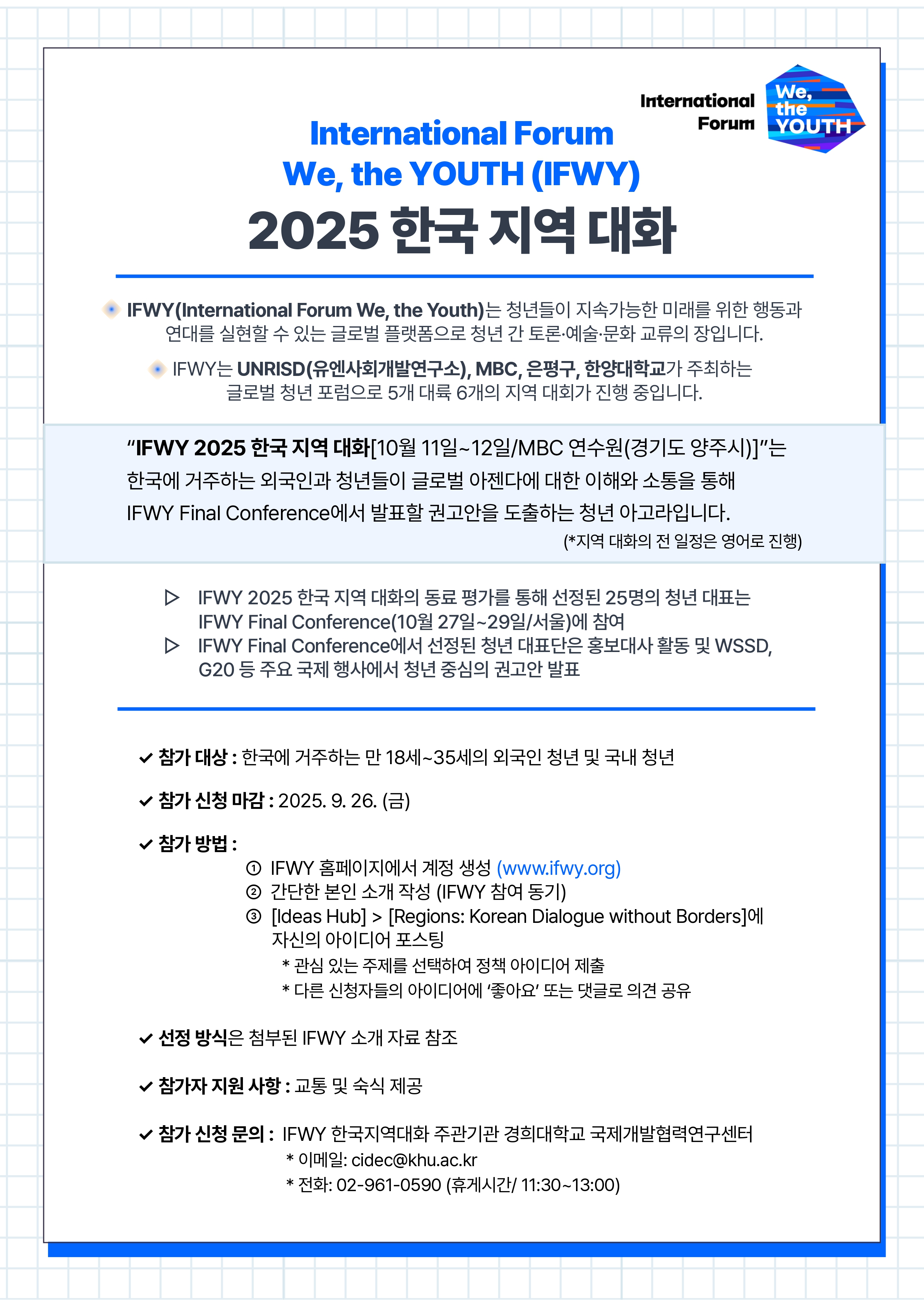 “IFWY 2025 한국 지역 대화[10월 11일~12일/MBC 연수원(경기도, 양주)]”는 한국에 거주하는 외국인과 청년들이 글로벌 아젠다에 대한 이해와 소통을 통해 IFWY Final Conference에서 발표할 권고안을 도출하는 청년 아고라입니다. (*지역 대화의 전 일정은 영어로 진행)