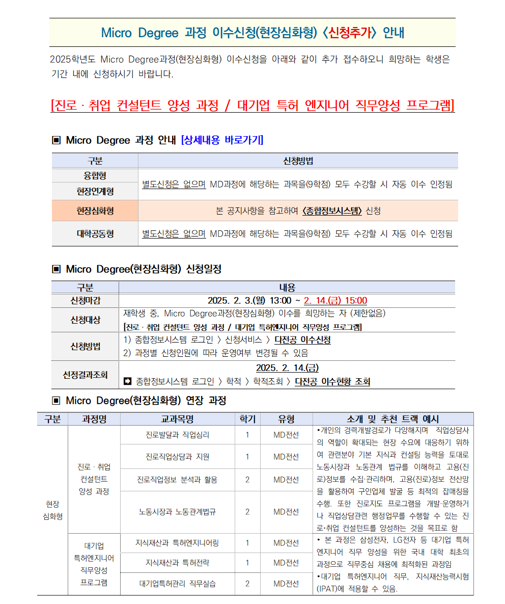 2025학년도 Micro Degree 과정(현장심화형) 이수 신청 추가 접수 안내 (2/14 마감)