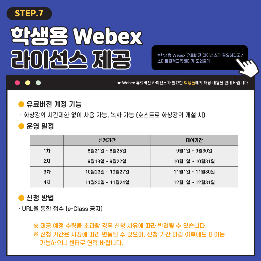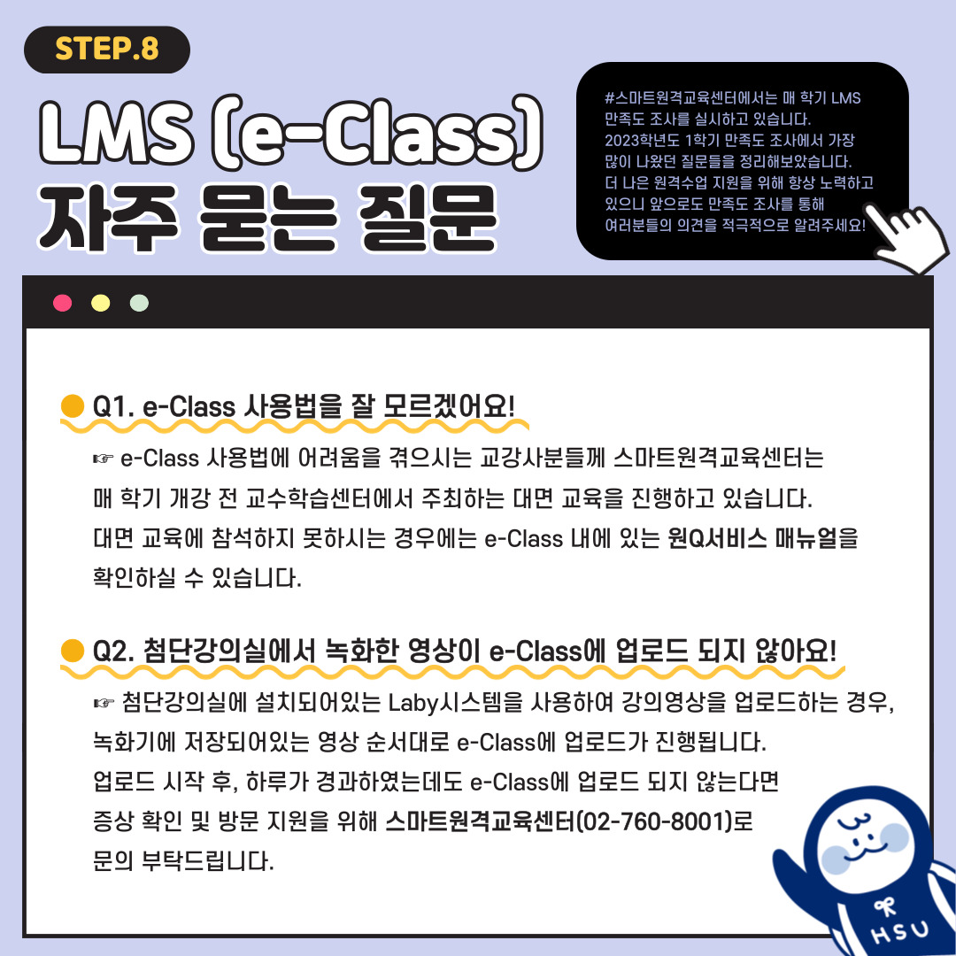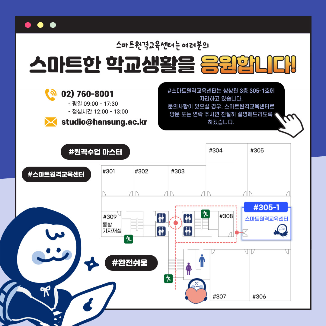 원격수업 준비 과정에서 진행까지 발생하는 각종 문의사항은 스마트원격교육센터(02-760-8001)로 연락주시기 바랍니다.