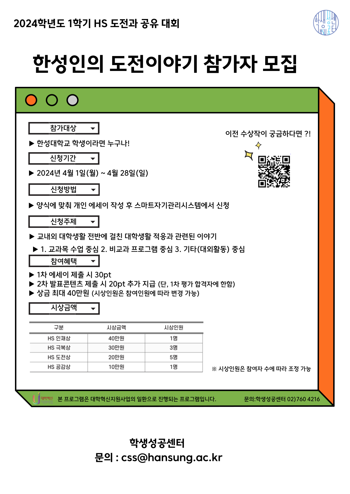 24학년도 1학기 한성인의 도전이야기 모집 안내를 드리오니,
