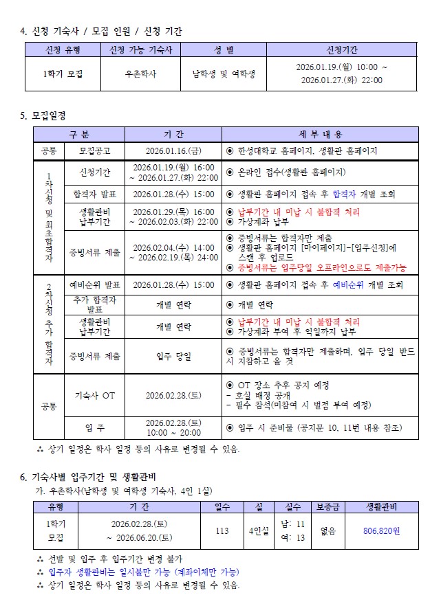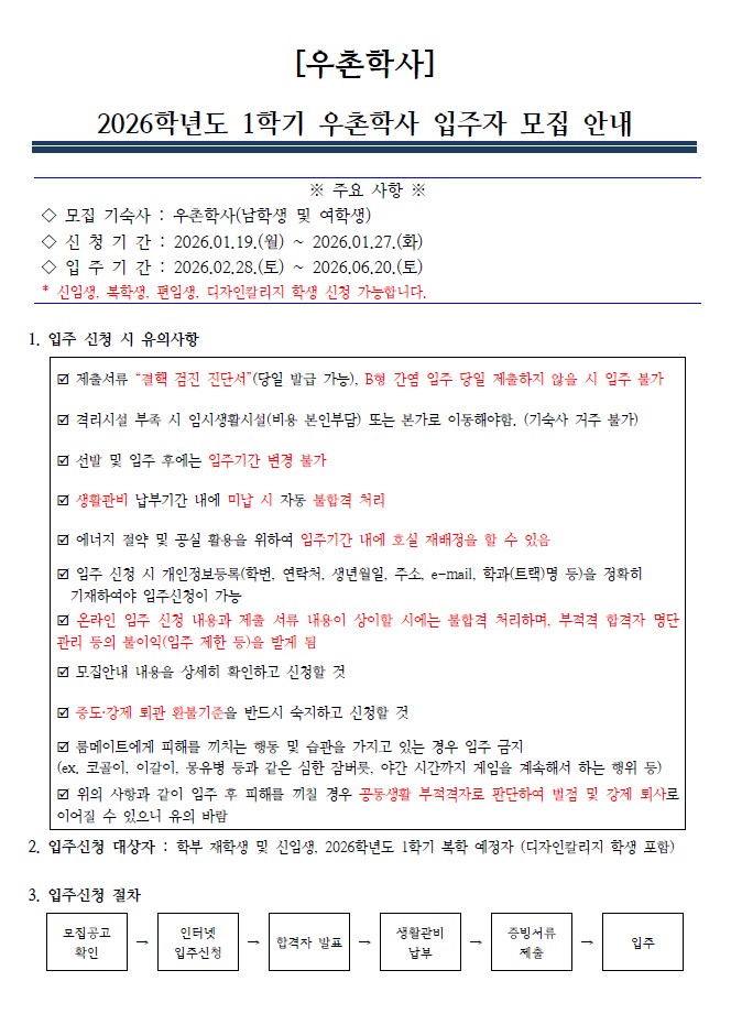 [우촌학사] 2026학년도 1학기 생활관 입주자 모집 안내(남/여학생 모두 신청 가능)