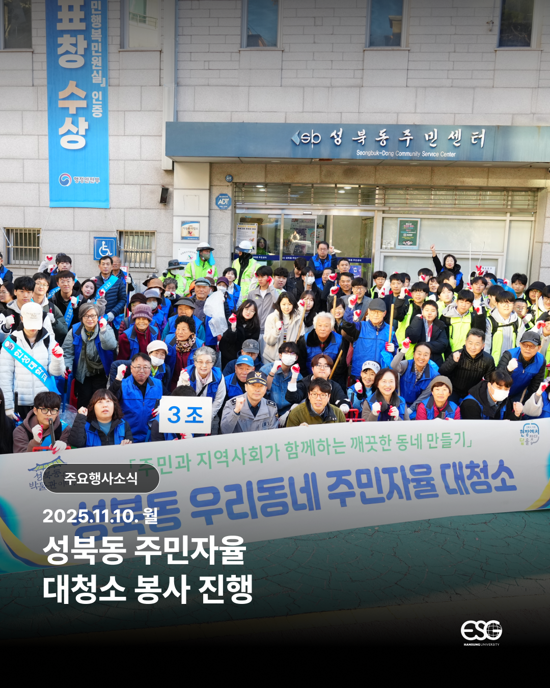 한성대학교 ESG센터와 사회봉사단 H.U.V 8기 외 내외국인 재학생 자율봉사자들이 참여한 활동은, 주변 환경을 정돈하는 행렬에 동참하여 지역 유지에 힘 쓸 수 있었고, 우리 삶의 터 곳곳 보지 못한 것들을 바라보게 된 뜻깊은 시간이었습니다.