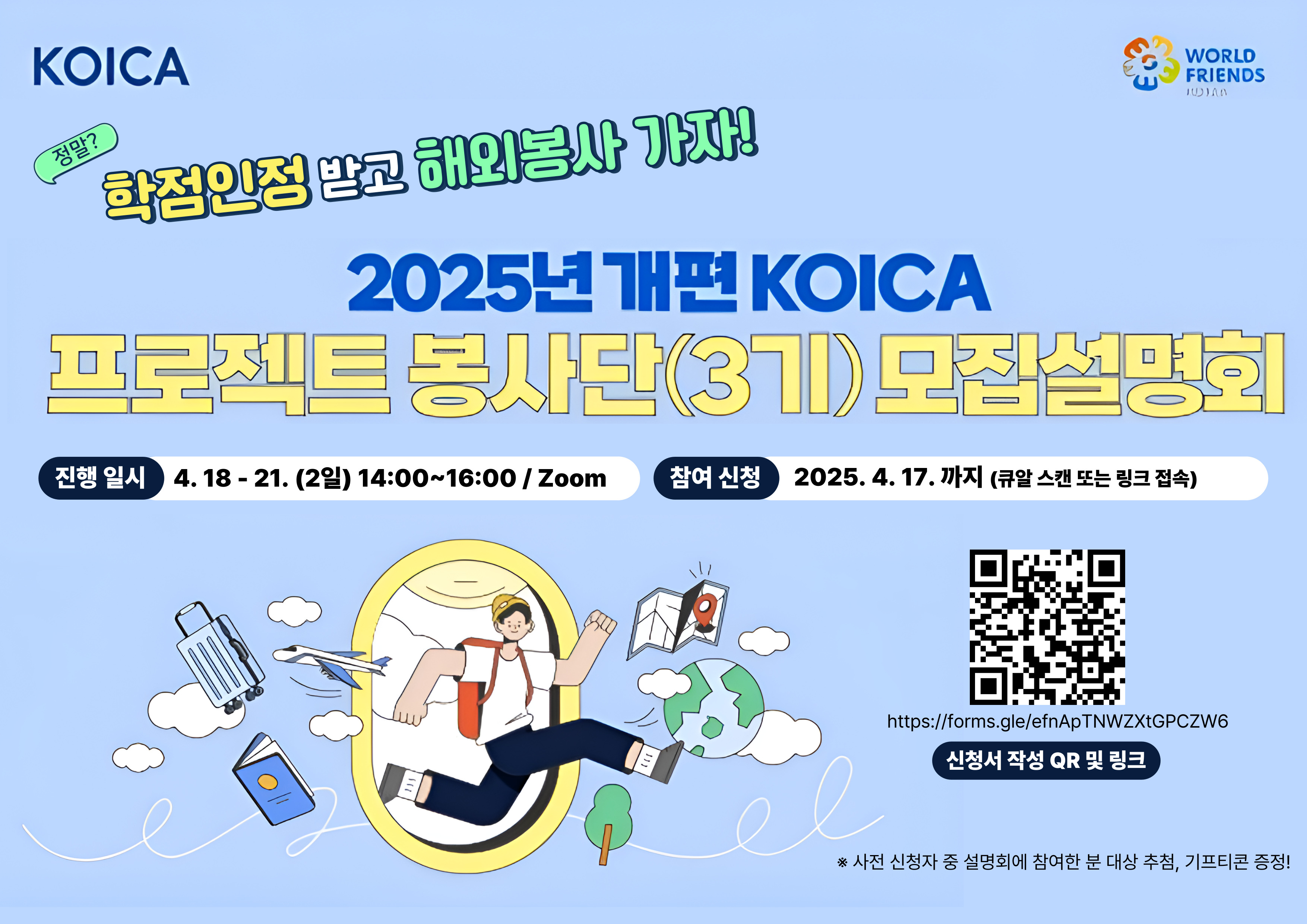 - (14:00~15:00) KOICA 해외봉사단 소개 | 사업 및 모집정보 안내, 학점인정 제도 소개