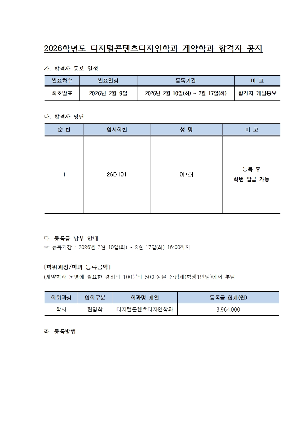 2026학년도 디지털콘텐츠디자인학과(계약학과) 합격자 공지