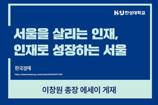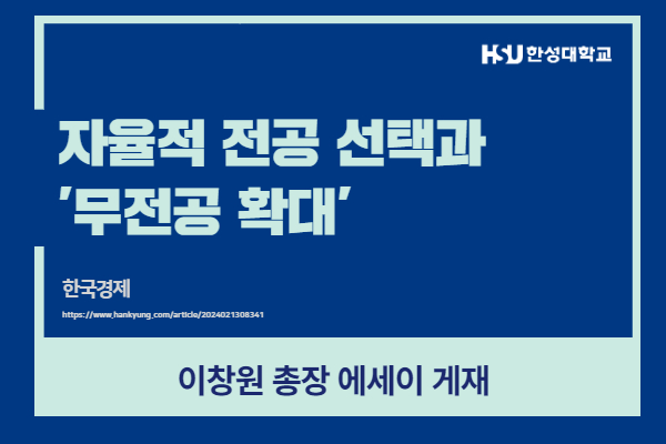 2024년 2월 동문소식 김숙자 무용학과 명예교수, 문화대상 수상 (제15회 서울문화투데이) 이창원 총장 에세이 (자율적 전공 선택과 '무전공' 확대) 이창원 총장 에세이 (서울을 살리는 인재, 인재로 성장하는 서울)