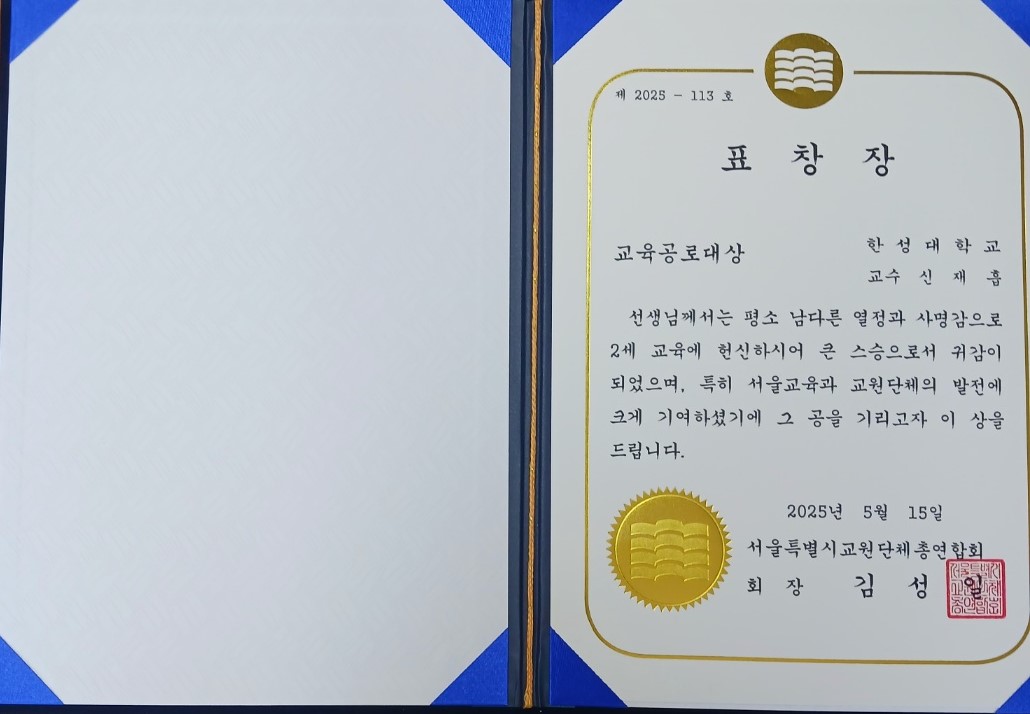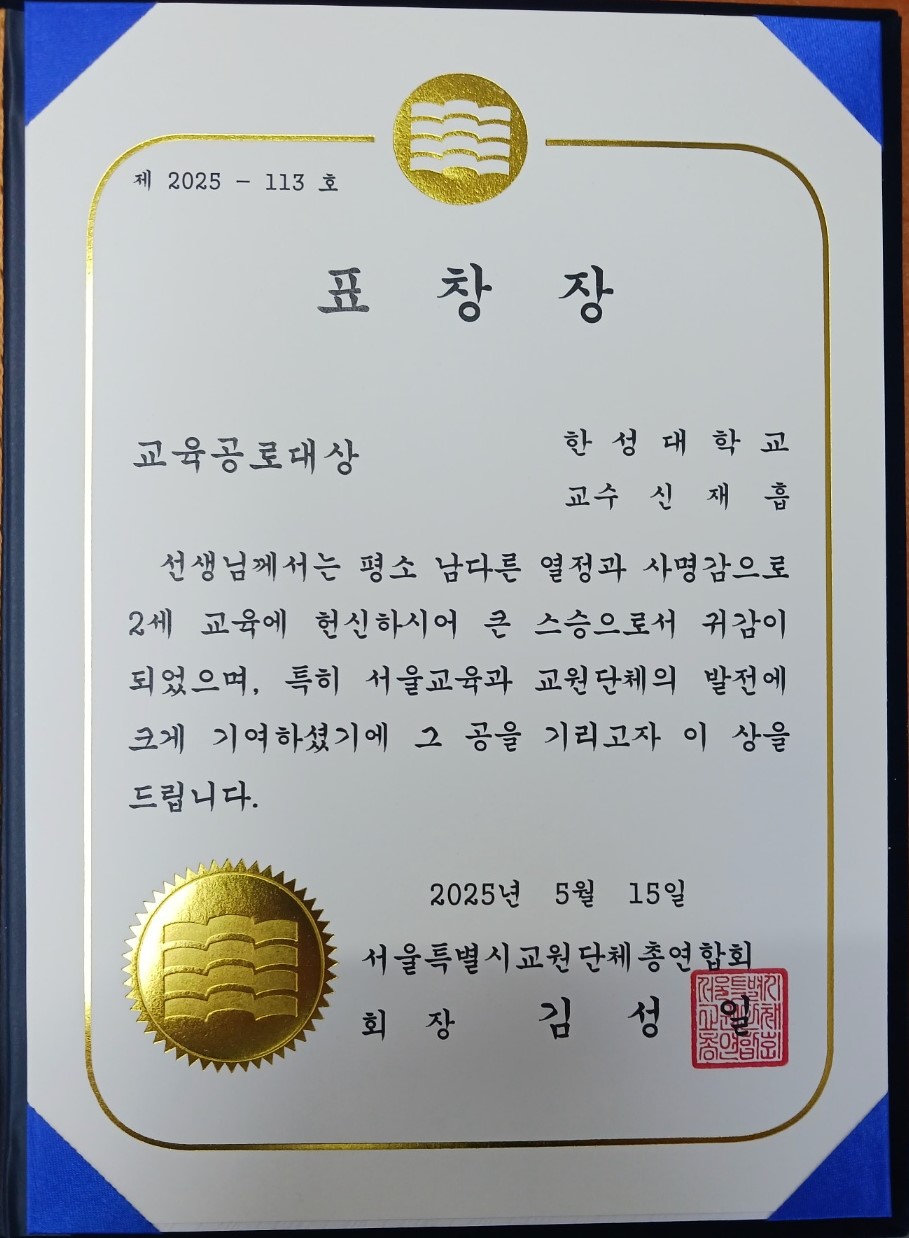 신재흡(한성대학교 교육대학원장) 표창장(제2025-113호) 서울특별시교원단체총연합회 교육공로대상 수상(2025.5.15 수상)