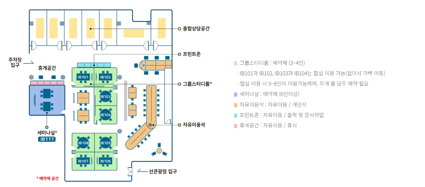 예약제로 이용가능한 그룹스터디룸, 세미나실과 자유롭게 이용가능한 개인석, 프린트존, 휴게공간이 마련되어 있습니다.
