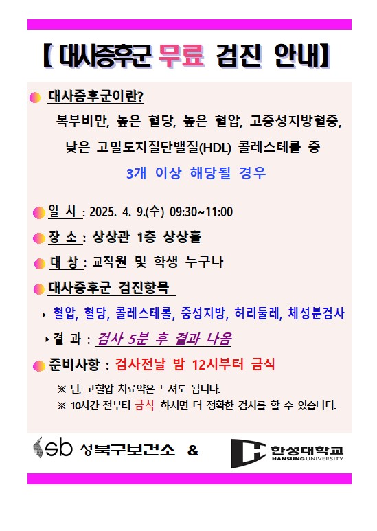 [건강관리실] 대사증후군 무료 검진 안내