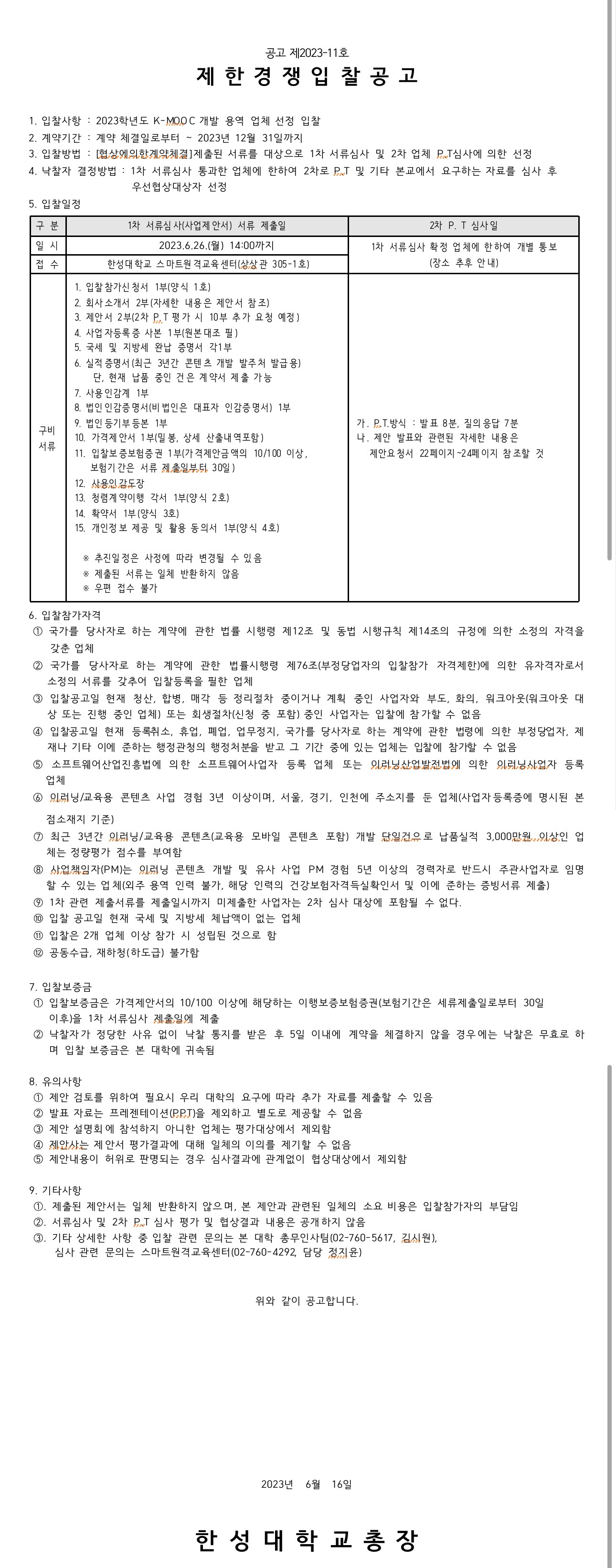제2023-11호 2023학년도 K-MOOC 개발 용역 업체 선정 입찰.hwp