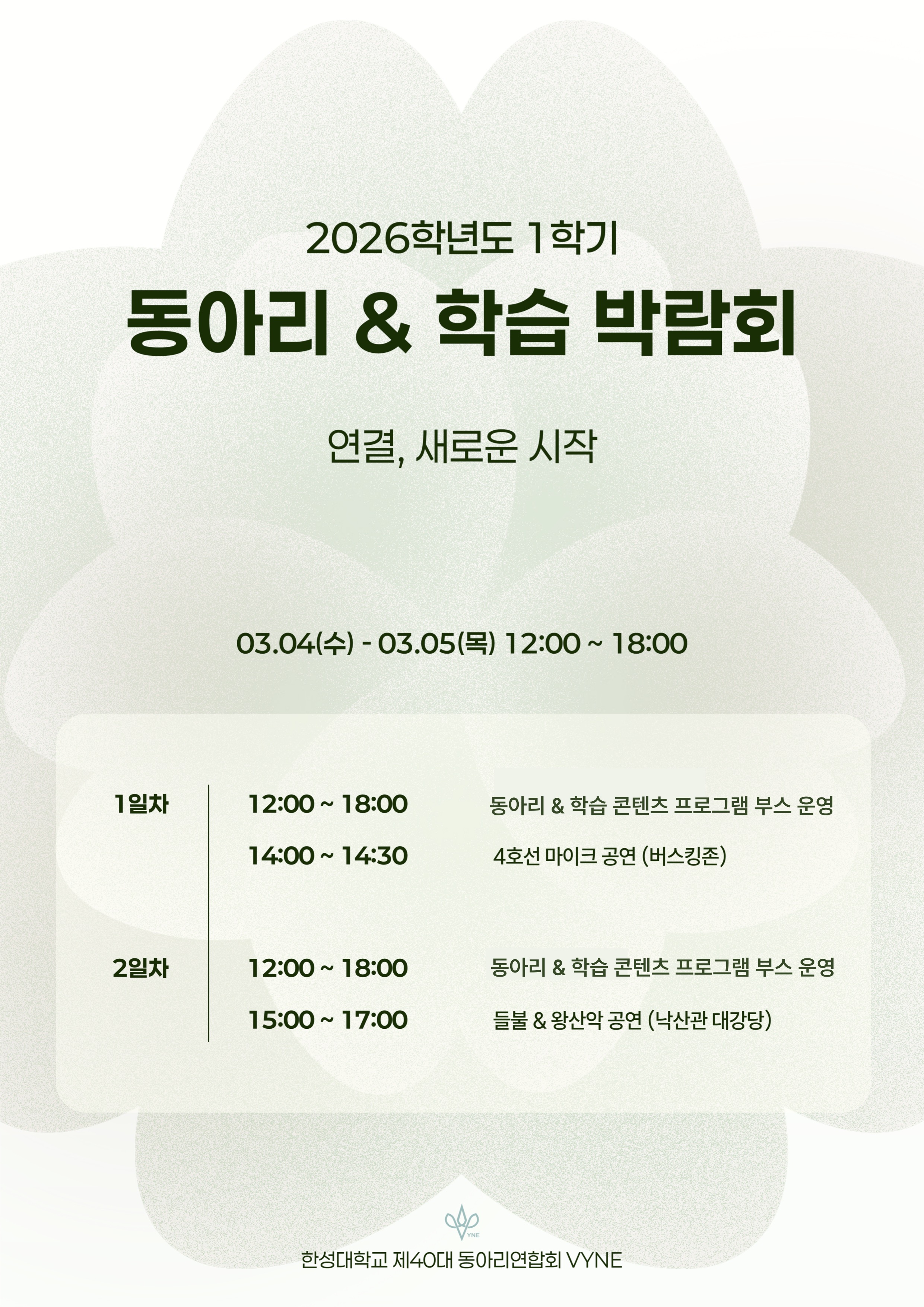 2026학년도 1학기 동아리 & 학습 박람회 행사가 3월 4일(수)부터 3월 5일(목)까지 2일간 진행합니다.