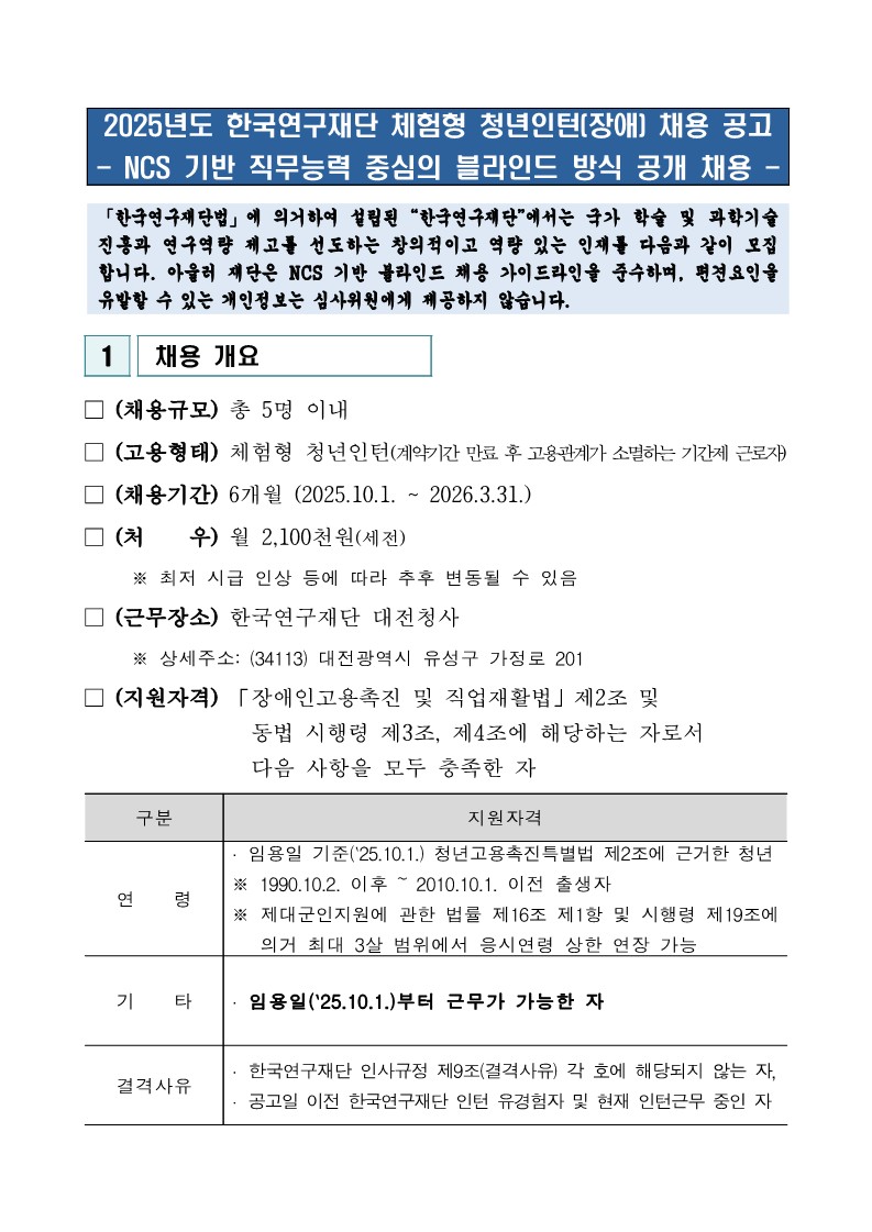 2025년도 한국연구재단 체험형 청년인턴(장애) 채용 공고