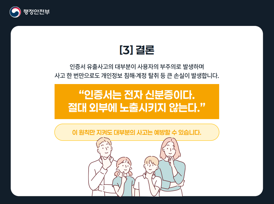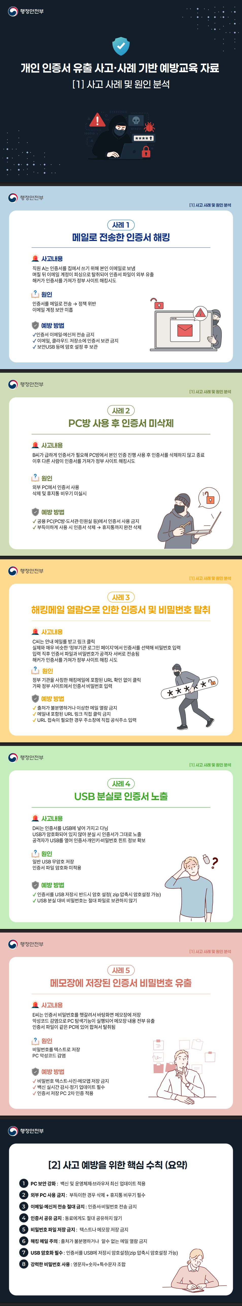 관련 사례를 포함한 교육자료를 안내드리오니, 내용을 읽어보시고 행정전자서명인증서 등 개인 인증서 사용 및 관리에 각별히 유의해주시기 바랍니다.