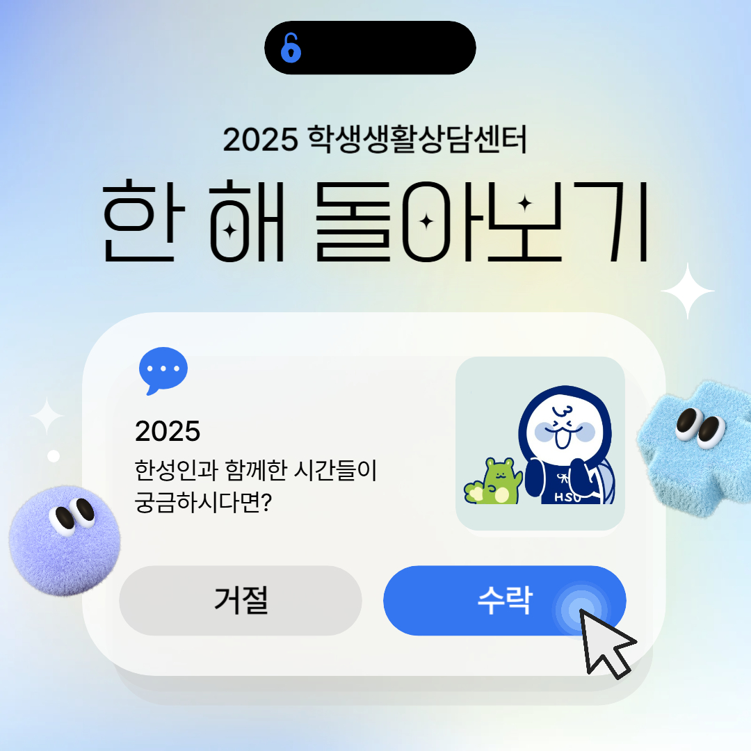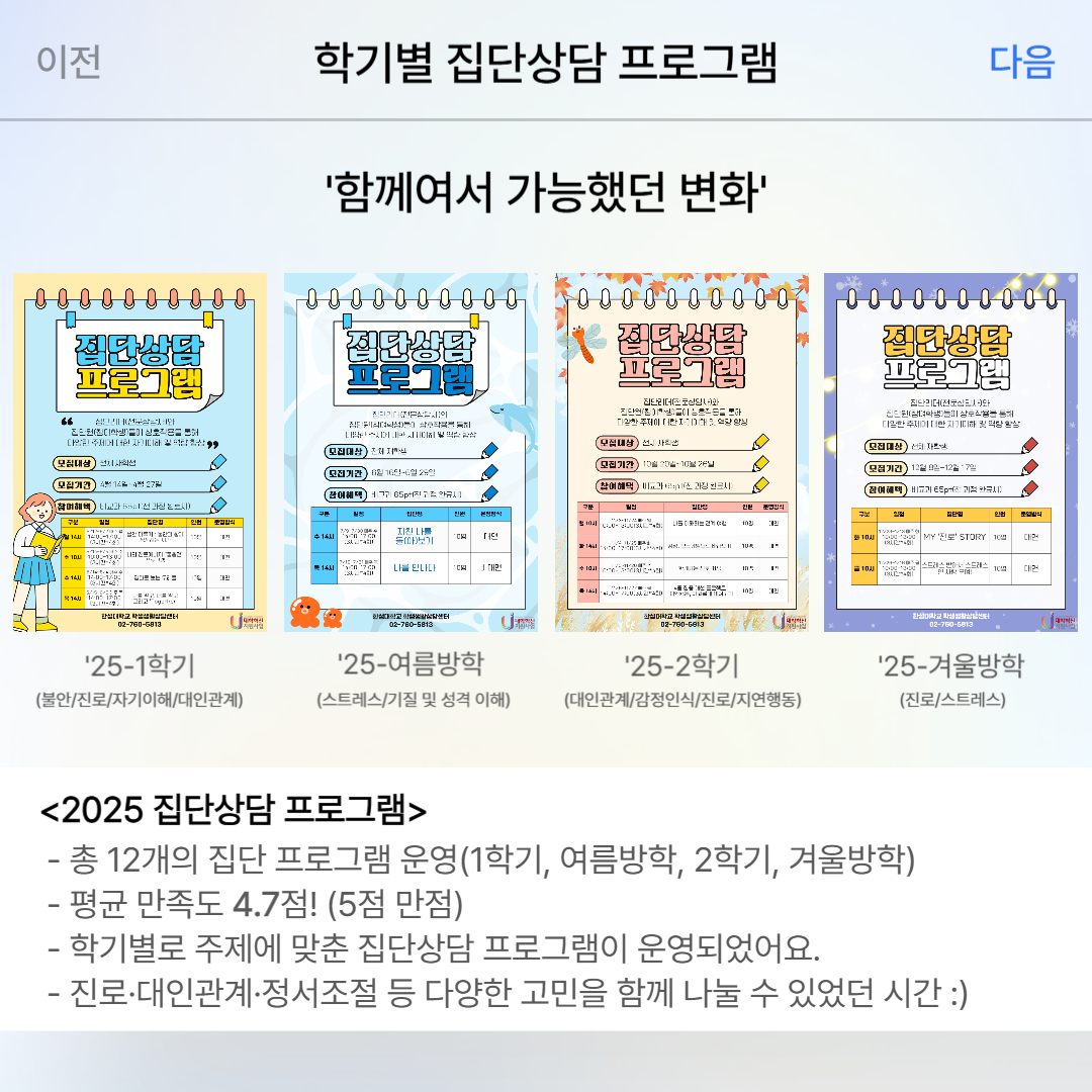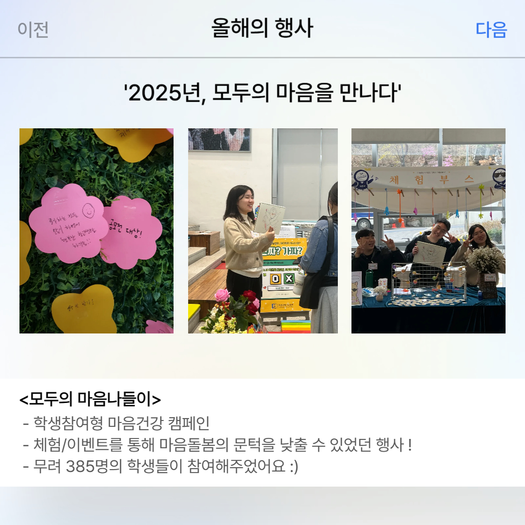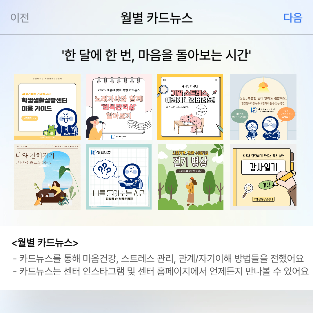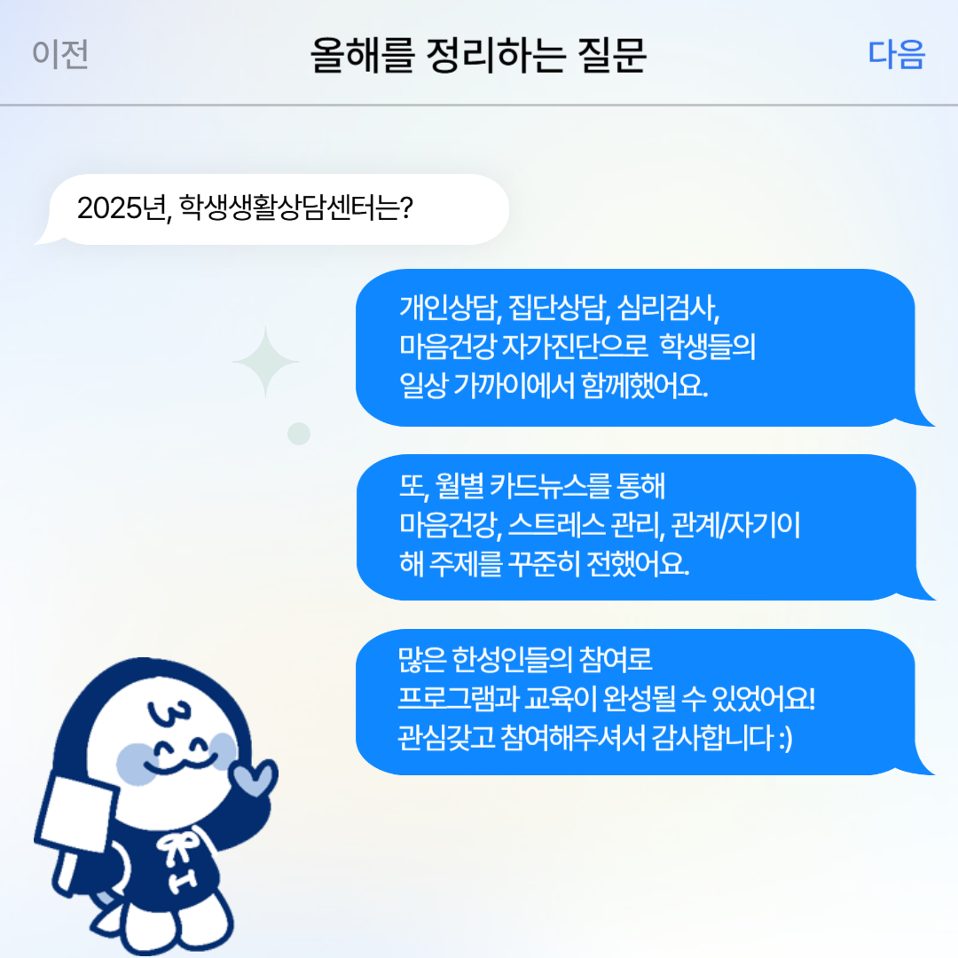 학생들의 마음 곁에서 함께한 순간들을 담았습니다. 상담, 프로그램, 마음건강 활동까지 학생생활상담센터의 한 해를 카드뉴스로 정리했어요. 올해도 함께해주셔서 감사합니다. 💙