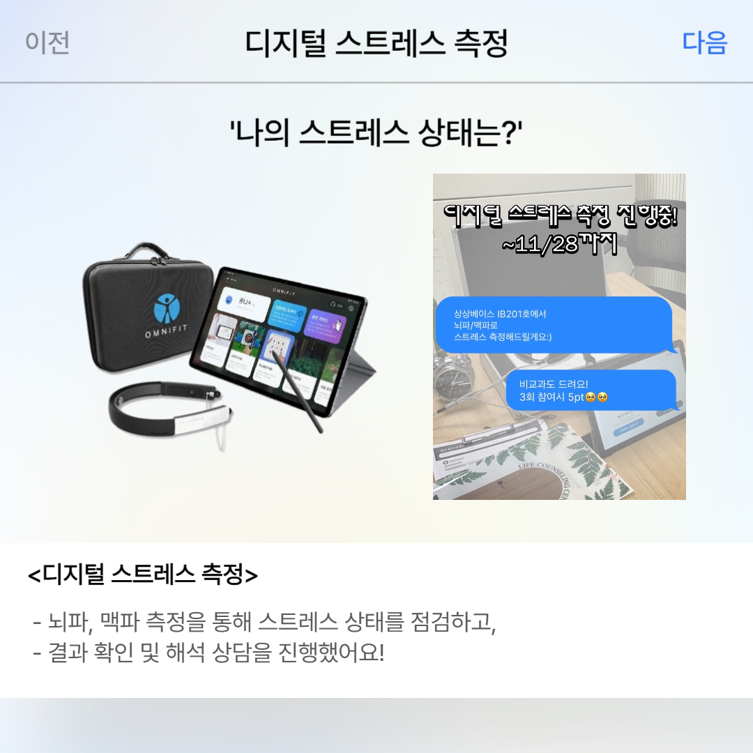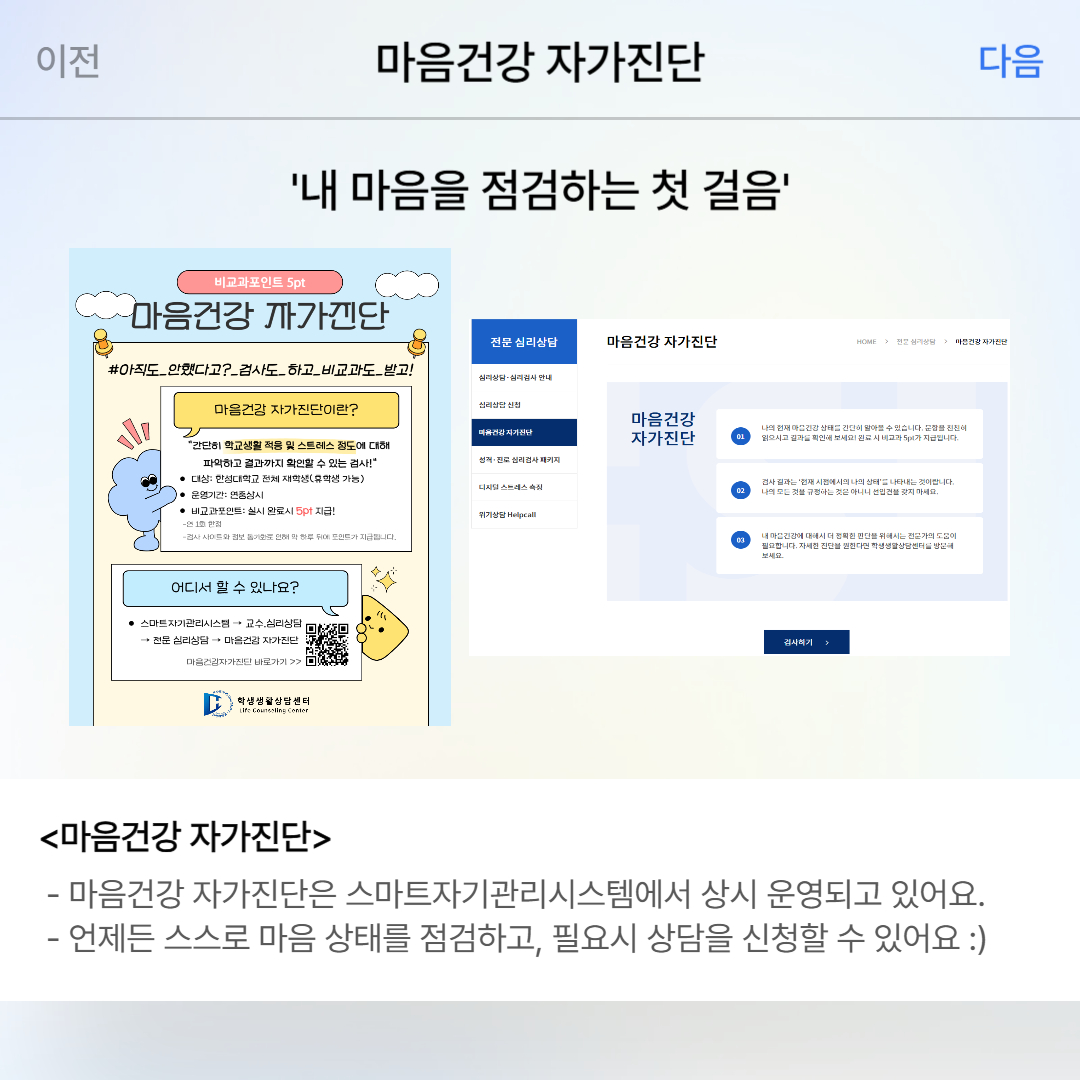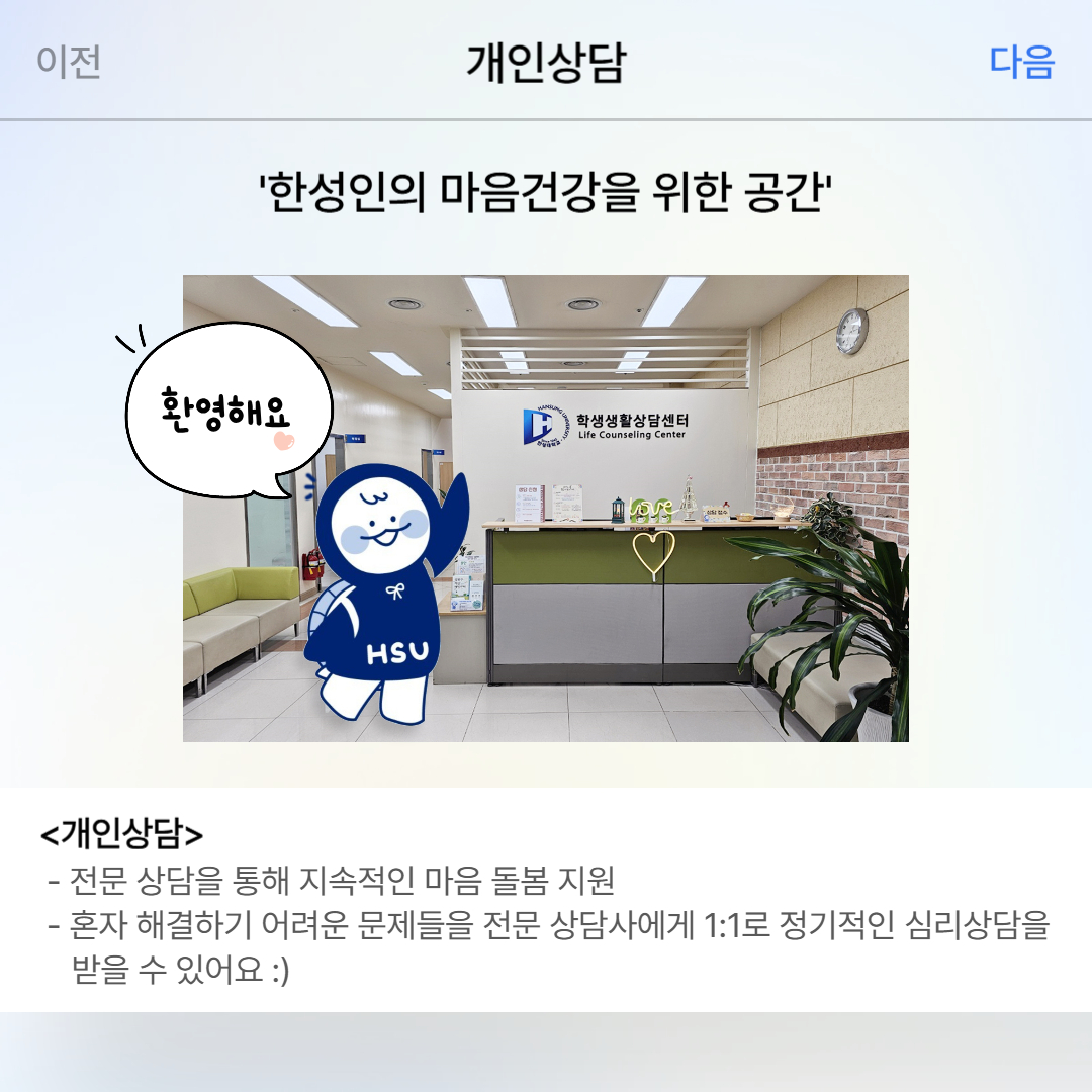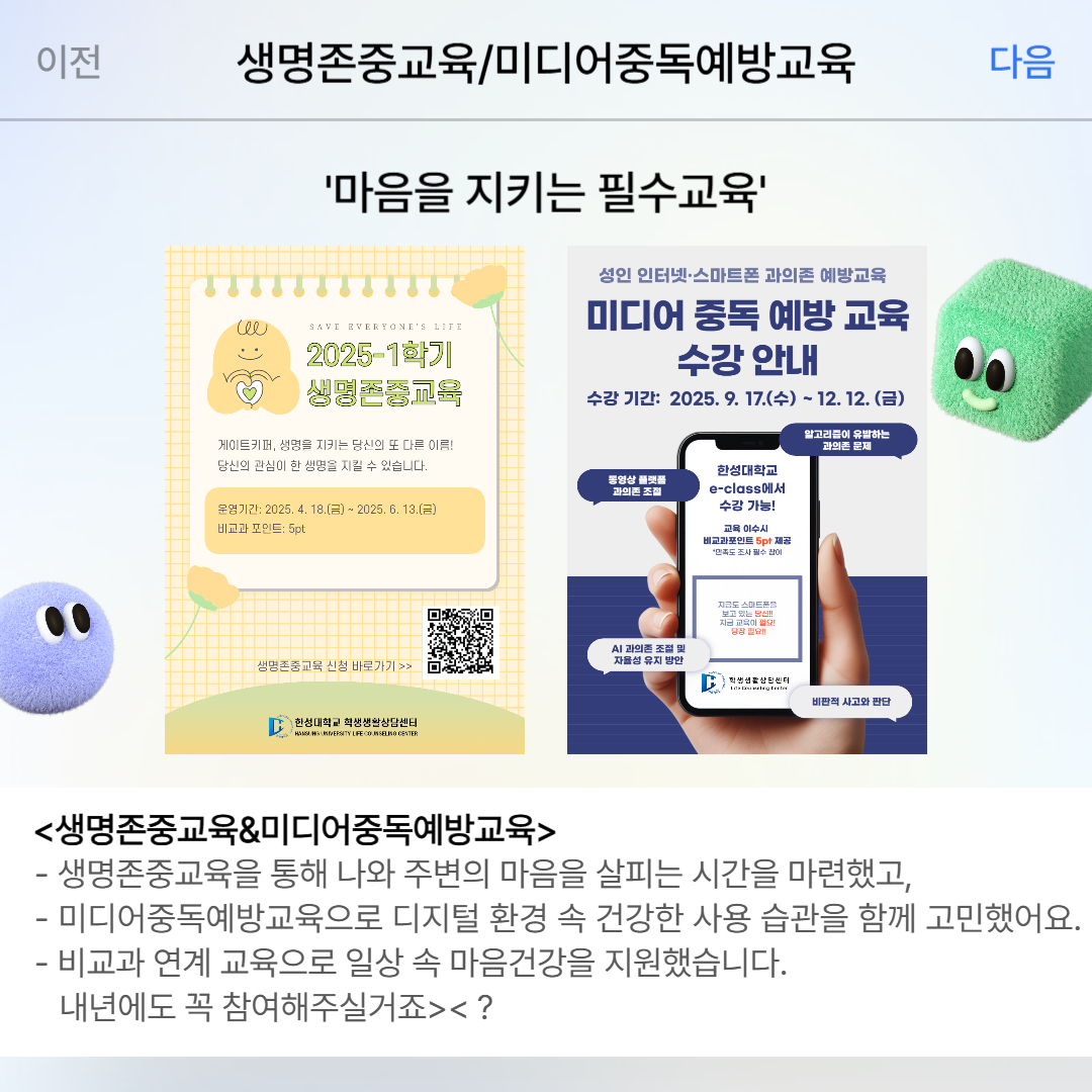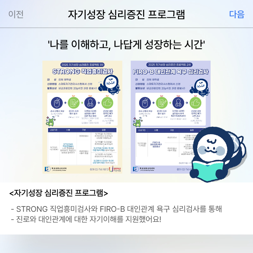 학생들의 마음 곁에서 함께한 순간들을 담았습니다. 상담, 프로그램, 마음건강 활동까지 학생생활상담센터의 한 해를 카드뉴스로 정리했어요. 올해도 함께해주셔서 감사합니다. 💙