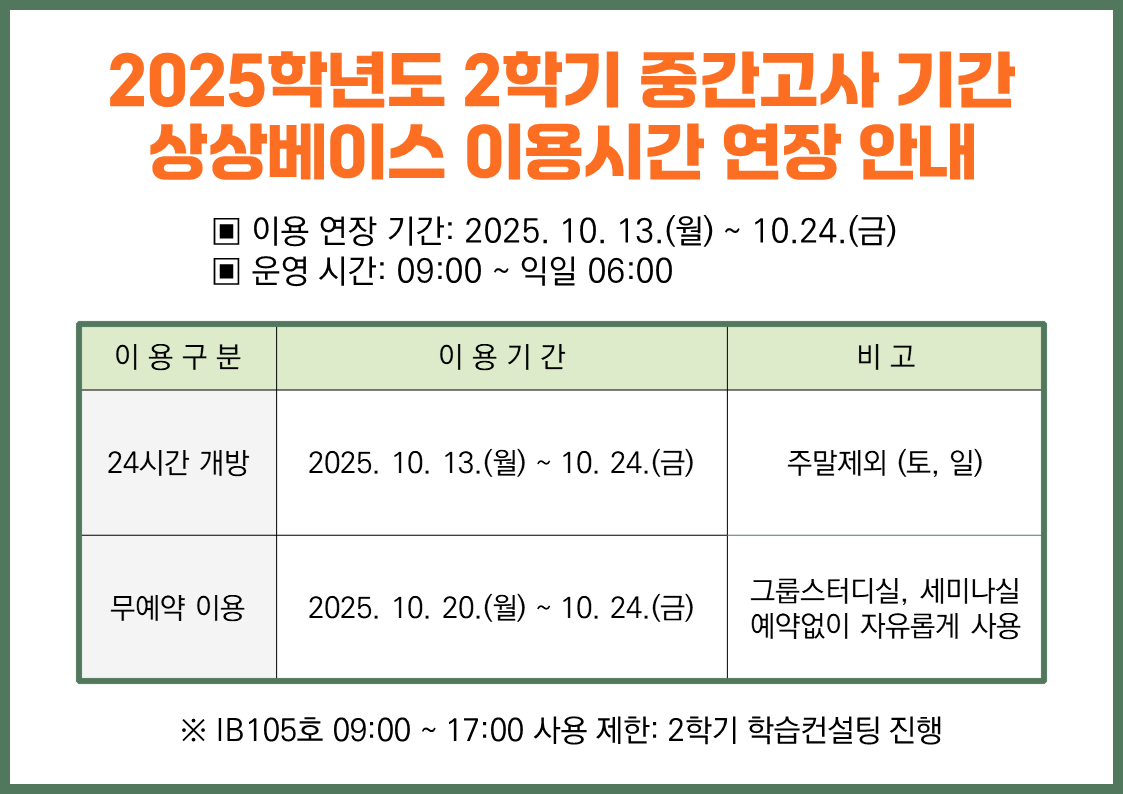 2025학년도 2학기 중간고사 기간 상상베이스 이용시간 연장 안내