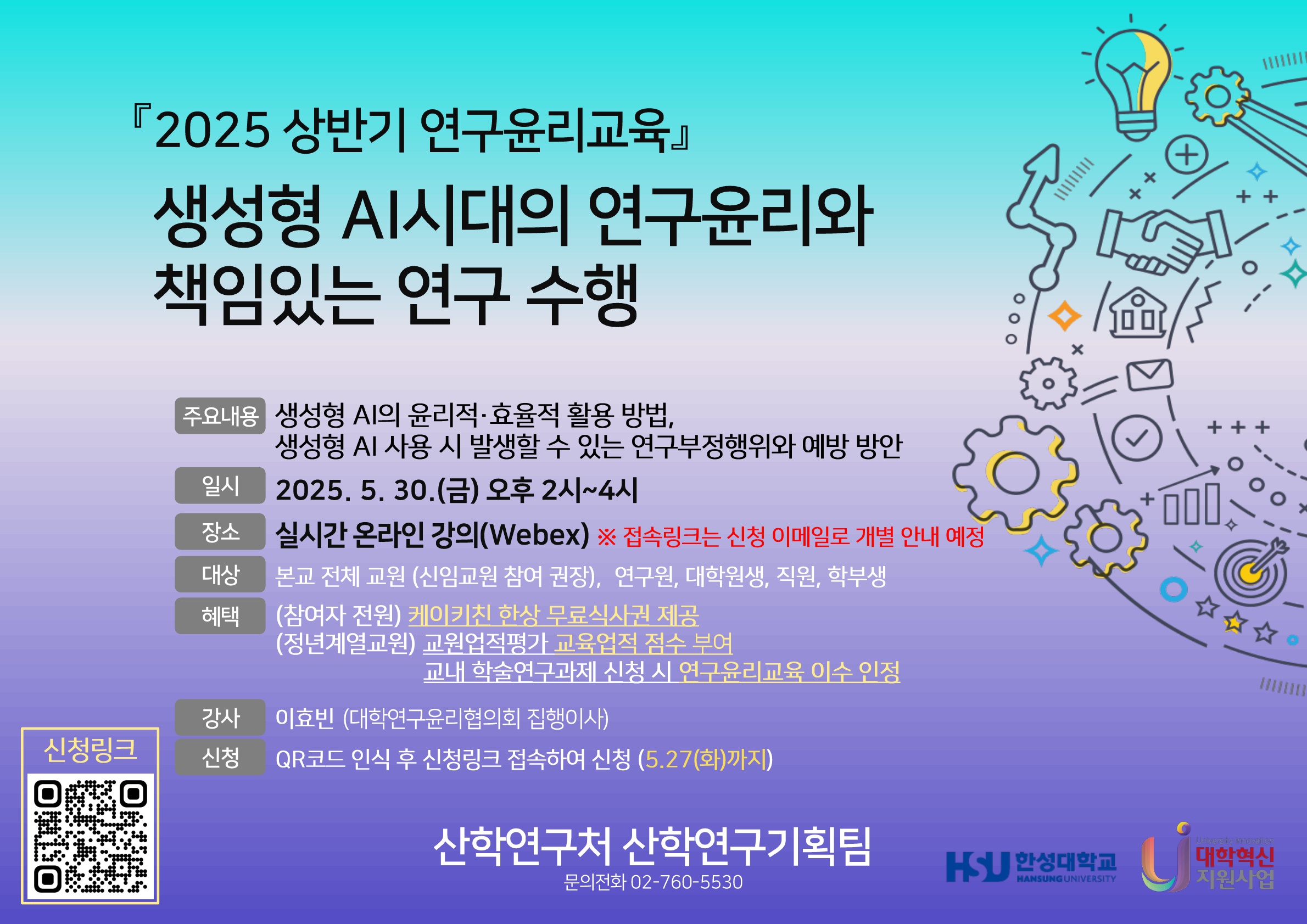 2025년 상반기 연구윤리교육을 시행하고자 하오니 많은 관심과 참여 부탁드립니다.