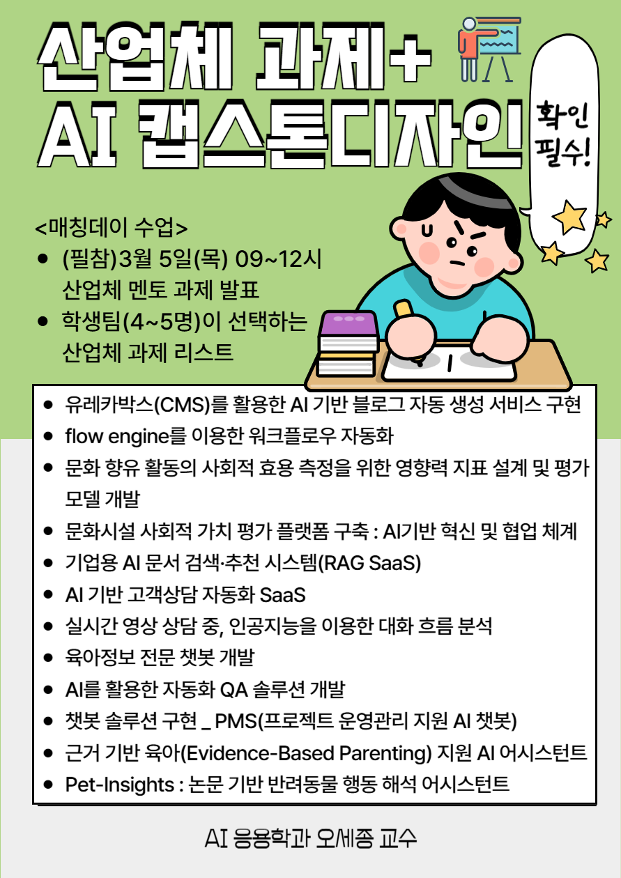 산업체와 직접 연계하여 실제 과제를 해결하는 AI 캡스톤디자인 교과목을 안내드립니다.