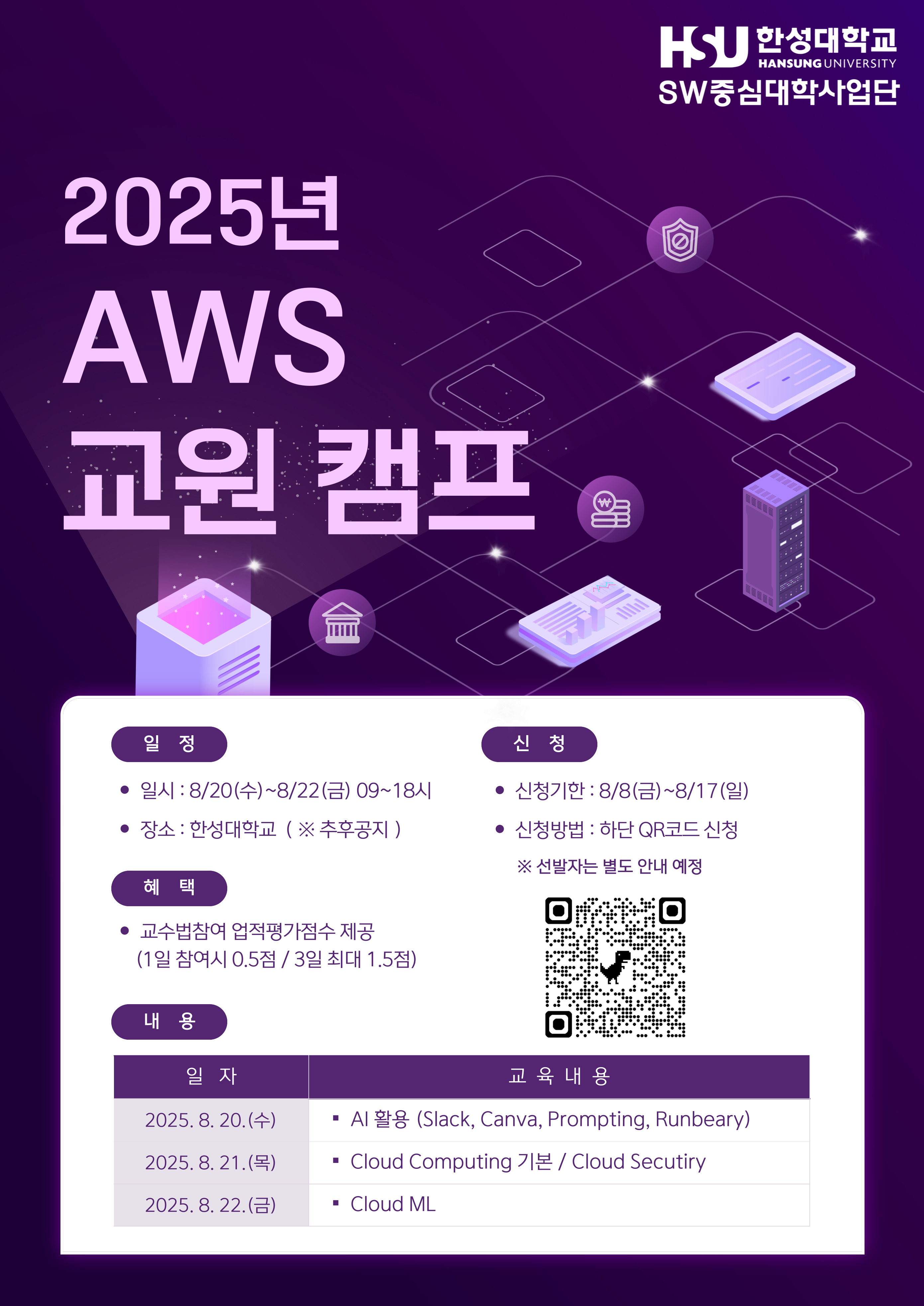 본 사업단에서 주관하는 「2025 AWS 교원 캠프」 참가 신청을 안내드립니다.