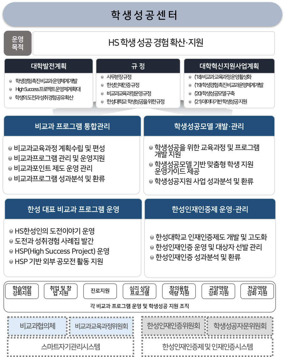 - 한성대학교 학생성공센터는 입학부터 졸업 이후까지 학생들의 진로개발 과정에서 학생 성공을 위한 교육과정 및 프로그램을 연구·개발하고 학생 성공의 관점에서 프로그램의 성과를 분석하고 필요한 지원을 제공하는 업무를 수행하고 있습니다.