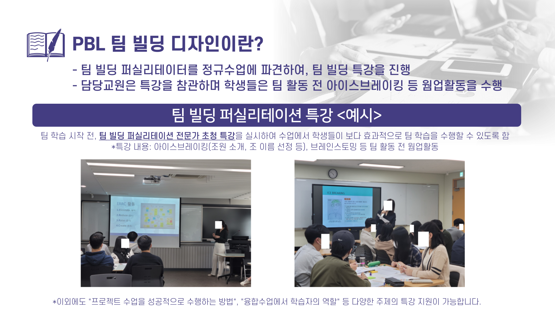 - P.B.L팀빌딩 디자인: 팀프로젝트 수업운영 교수자 대상, 팀 퍼실리테이팅 전문가를 수업에 파견하여 직접수업 시연 장면을 관찰함으로써 수업운영역량 강화 지원