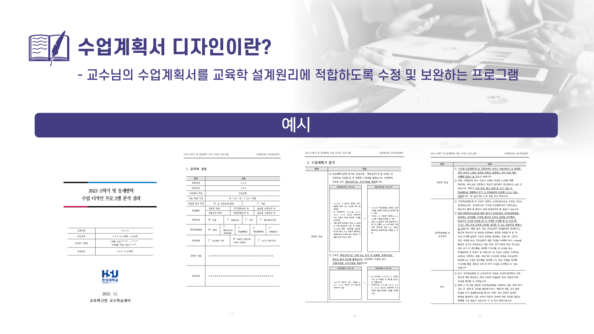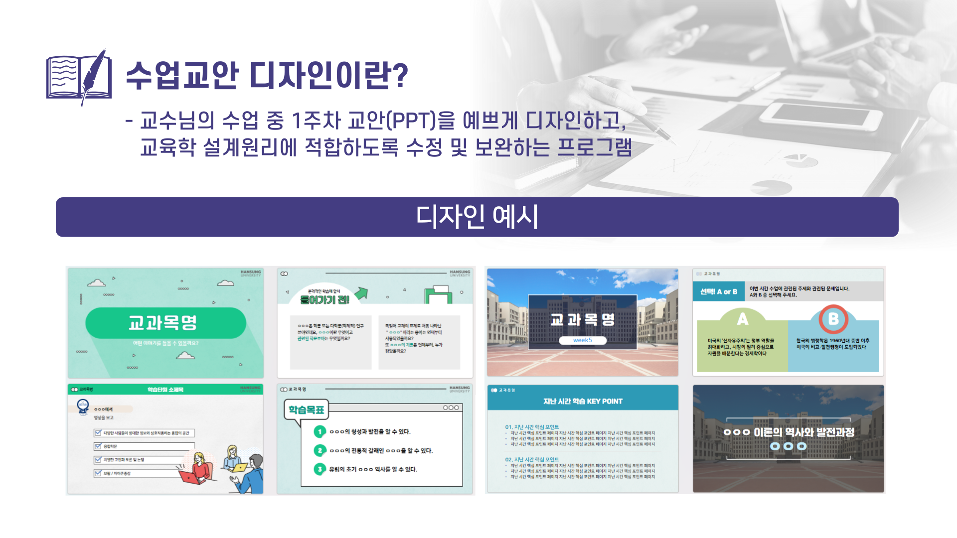 수업디자인 프로그램은 수업의 질적 제고를 지원하는 프로그램입니다.