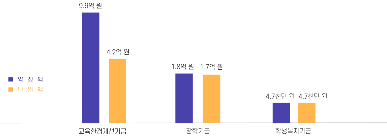 2021학년도에는 167명의 기부자가 12억 1천 5백만 원의 기부 약정해 주셨습니다. 가장 많이 약정된 용도는 교육환경개선기금으로 전체 기부 약정액 중 81%를 차지했습니다. 그 다음은 장학기금, 학생복지기금 순으로 기부 약정되었습니다.