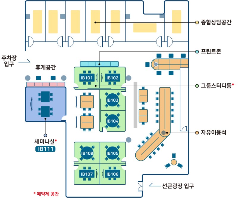개인학습, 팀 프로젝트, 세미나, 상담 등을 지원하는 교육·학습 복합공간입니다.